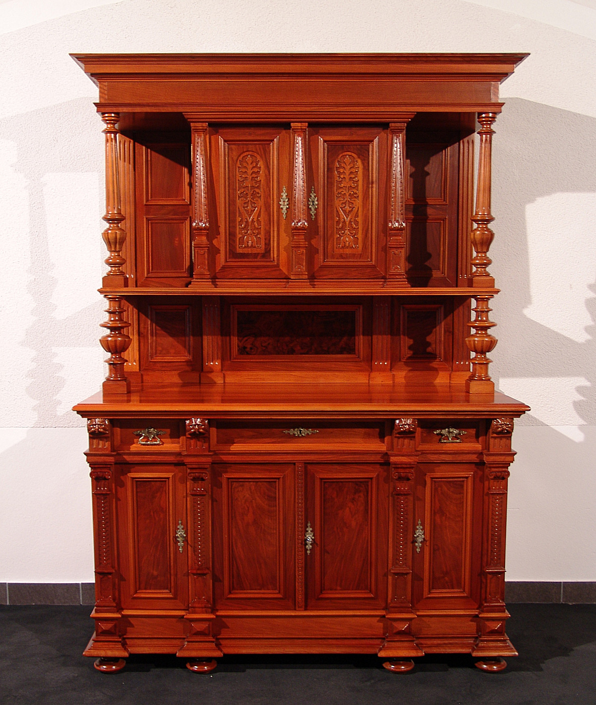 Alles in allem zeichnet sich dieses Aufsatzbuffet durch seine ausgewogene Gestaltung aus, welche nichts von der Gründerzeit-typischen Pracht vermissen lässt, dabei jedoch, trotz aufwendiger Details, an keiner Stelle zu dick aufträgt. Das Möbel befindet sich in einem restaurierten Zustand und kann in unserer Ausstellung besichtigt werden.